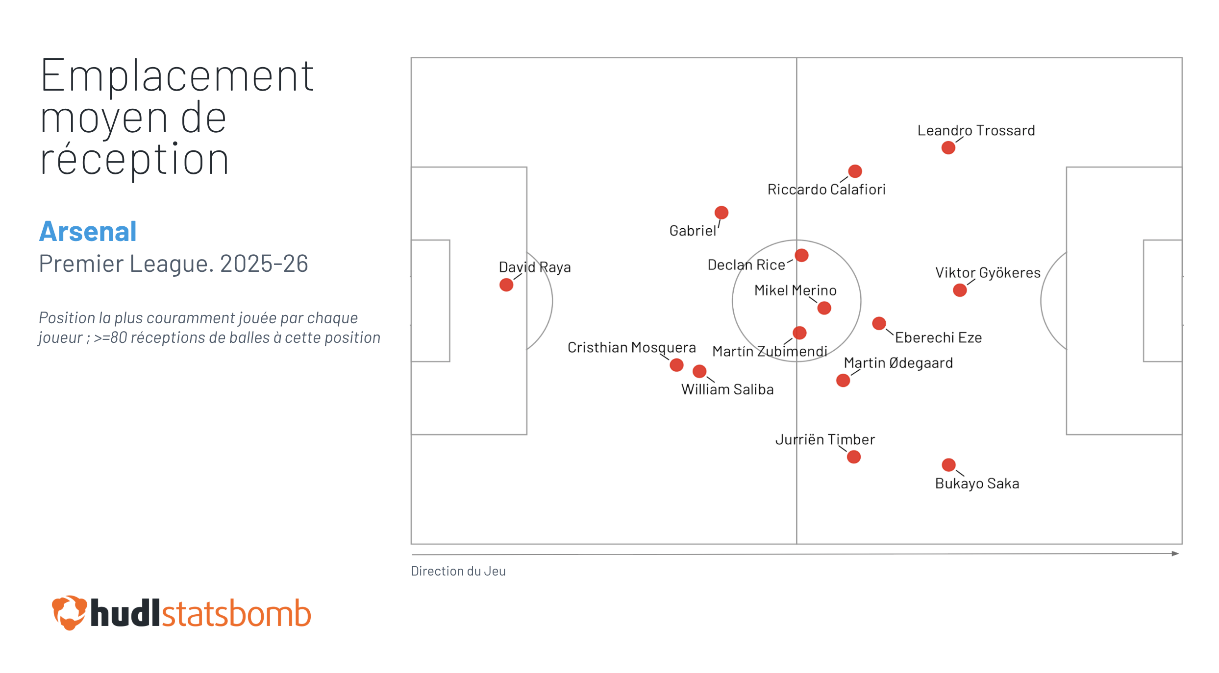 Si nous prenons l'emplacement moyen de réception de balle des joueurs d'Arsenal la saison dernière, en filtrant sur la position que chaque joueur a occupée le plus fréquemment…
