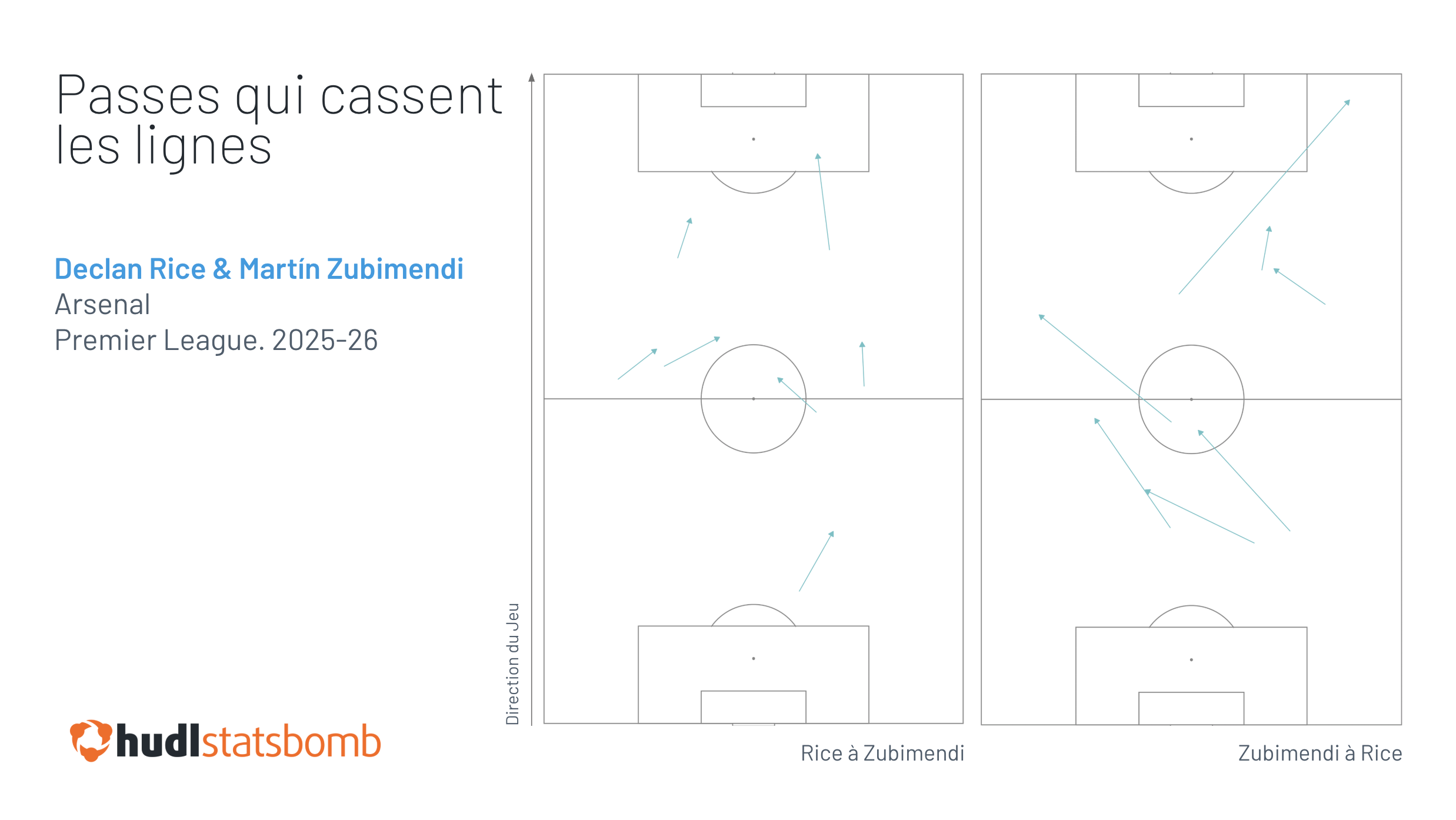 Rice et Zubimendi ont jusqu’ici échangé seulement cinq passes cassant les lignes de moins (14) que Rice et Partey ne l'ont fait sur l'intégralité de la saison dernière, et la répartition est également beaucoup plus équitable. La saison dernière, Rice était principalement une option vers l'avant pour les passes de Partey, représentant 17 des 19 passes cassant les lignes qu'ils ont échangées ; cette saison, Rice et Zubimendi en ont partagé sept chacun.